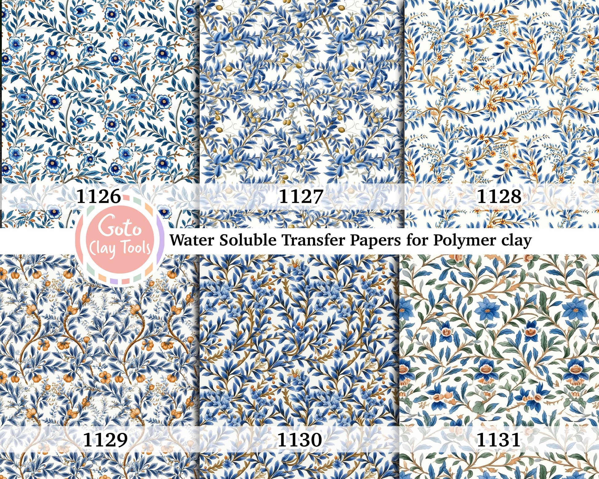Blue leaves chinoisserie pattern Transfer paper for polymer clay, water soluble transfer paper, polymer clay image transfers, magic transfer paper