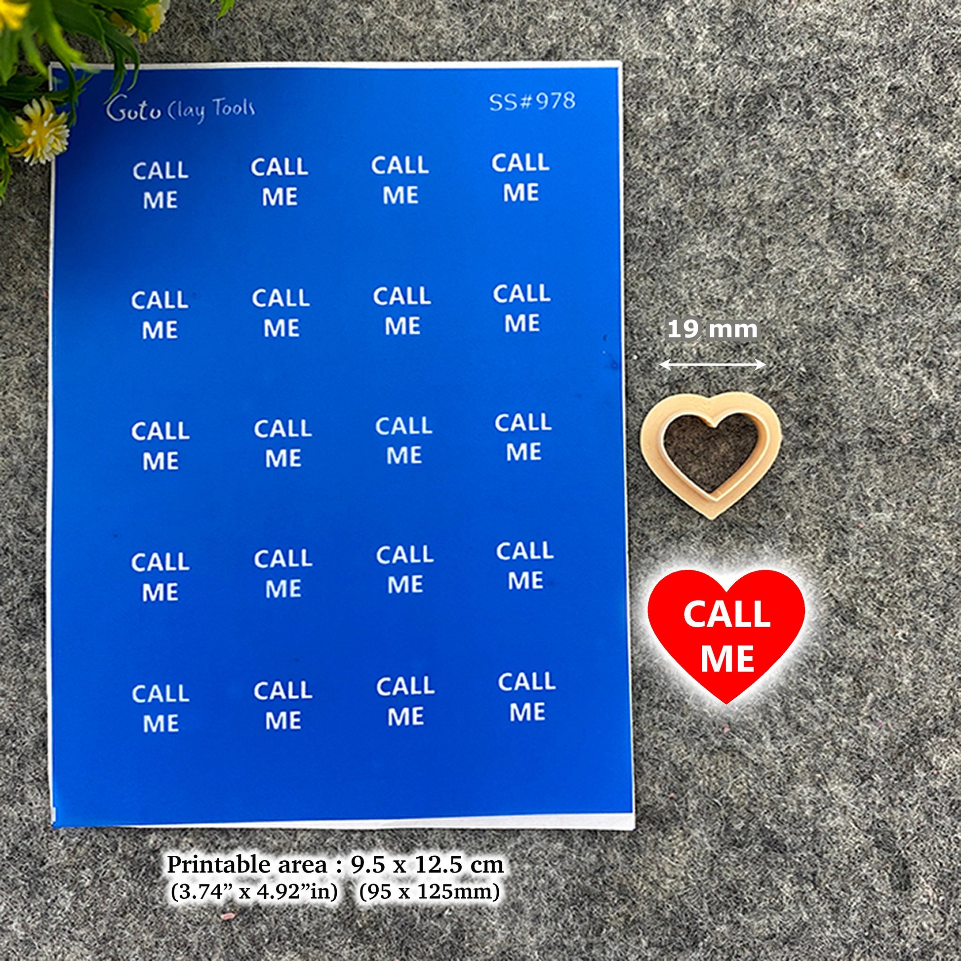 CALL ME silkscreen with heart shape 19 mm cutter for Polymer clay jewelry, silkscreen for printing on polymer clay for pot or clay artists.
