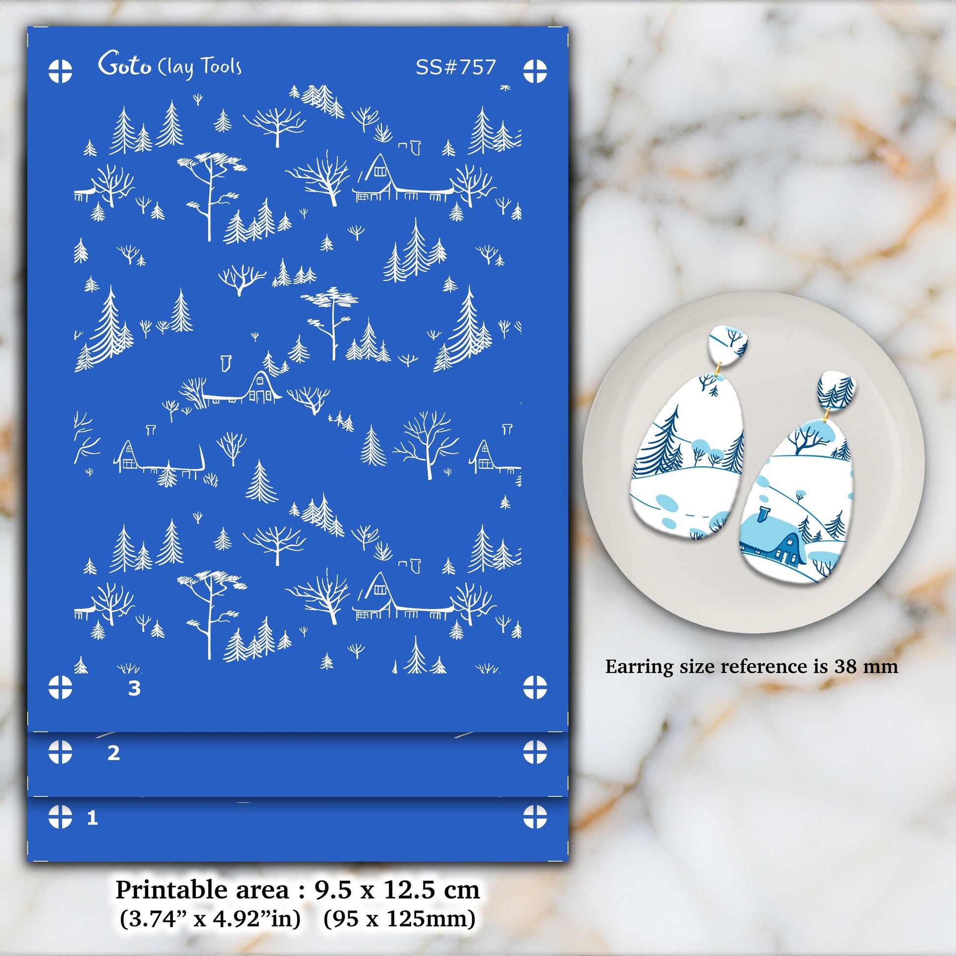 Christmas Snow Hill Silkscreen for Polymer Clay Earrings: 3-Layer Stencil SS#757