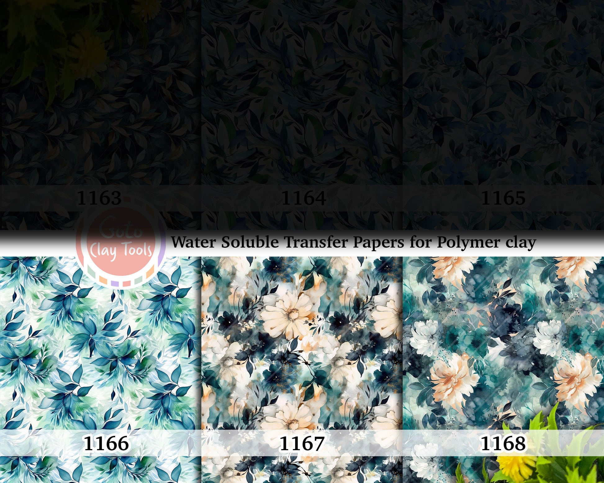 Water soluble Transfer paper for polymer clay, Abstract Aqua leaves and floral pattern, polymer clay image transfers, magic transfer paper